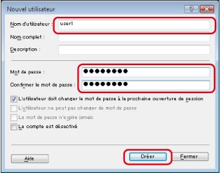 Dans la boîte de dialogue [Nouvel utilisateur], saisir le nom d'utilisateur dans [Nom d'utilisateur] → saisir le mot de passe dans [Mot de passe] → saisir à nouveau le mot de passe dans [Confirmer le mot de passe] → cliquer sur [Créer].