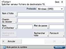 Si la langue de l'afficheur tactile est différente de celle de l'ordinateur utilisé comme navigateur principal, [Nom d'hôte] et [Chemin du dossier] risquent de ne pas s'afficher correctement ou il sera impossible de parcourir les dossiers.