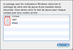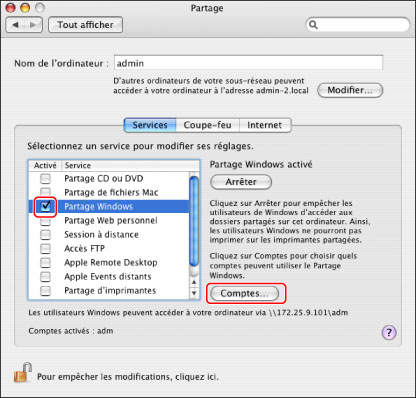 Sélectionner [Partage Windows] → cliquer sur [Activer les comptes].