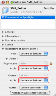 Dans [Propriétaire et autorisations], autoriser la lecture/l'écriture pour le propriétaire et les membres du groupe.