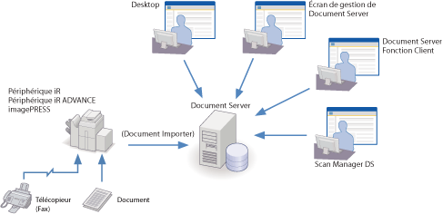 Document Server est un serveur de gestion de documents qui utilise Document Server Client Function ou Desktop comme clients. Outre les documents créés à l'aide de ces clients, il peut également mémoriser des documents lus via le réseau, comme ceux de la série iR de périphériques numériques multifonctions et de la série DR de scanners de documents. Il permet ainsi de mettre en place un système très fonctionnel de gestion des documents mémorisés.