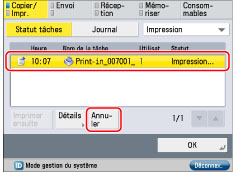 Il est possible d'arrêter l'impression pour annuler une tâche d'impression au moment où les données sont en cours de réception ou d'exécution. Les données d'impression des tâches suivantes ou des tâches que la machine n'a pas encore commencé à traiter ne sont pas affectées.