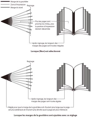 l'impression soit coupée (en fonction du nombre de pages et de l'épaisseur du papier lors du rognage des bords pour les rendre réguliers). L'utilisation de la correction du renflement pour régler la marge de la gouttière permet de corriger cette impression irrégulière (renflement).
