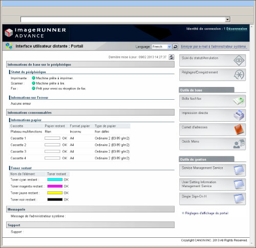 Cette interface utilisateur distante permet d'accéder à la machine via un réseau, et d'obtenir ainsi son statut et ses réglages actuels, mais également des informations sur les tâches en cours de traitement. Il est donc possible de gérer la machine depuis un ordinateur connecté au réseau sans utiliser son panneau de commande. Dès que l'adresse IP de la machine est saisie dans le navigateur Web, la page d'accueil, ou écran principal, de l'interface utilisateur distante s'affiche sur l'écran de l'ordinateur, comme illustré ci-dessous :