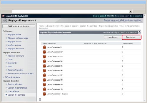 Cliquer sur [Listes d'adresses] pour <Importation/Exportation individuelle> → [Exportation...].
