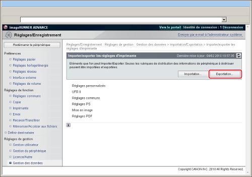 Cliquer sur [Réglages d'imprimante] pour <Importation/Exportation individuelle> → [Exportation...].