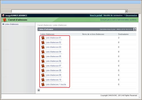 Les opérations de gestion de la liste d'adresses proposées sont identiques à celles accessibles à partir du panneau de commande de la machine en appuyant sur  → [Définir destinataire]. Pour plus d'informations sur l'utilisation du panneau de commande pour gérer la liste d'adresses, voir "Mémorisation des destinataires".