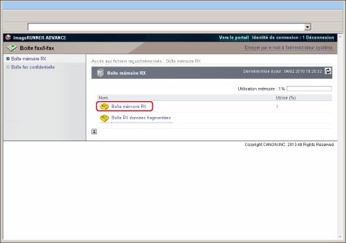 Cliquer sur [Boîte Fax/I-Fax] → [Boîte mémoire RX].