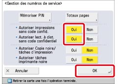 Les paramètres <Autoriser impressions sans code confid.> et <Autoriser lect. à dist. sans code confidentiel> ne sont activés que si la machine propose les fonctions d'impression et de lecture à distance.