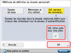On peut utiliser des dossiers personnels sans spécifier les informations d'authentification pour chaque utilisateur si les conditions ci-dessous sont remplies. Dans ce cas, désélectionner [Util. infos auth. pour chq utilis.].