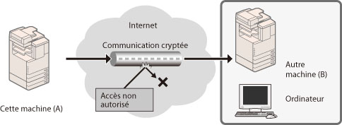 Il est possible de disposer d'une communication cryptée sûre lorsque l'utilisateur accède à la machine via un navigateur Web en installant un certificat de serveur sur la machine. Avec les communications SSL, la clé commune qui peut uniquement être utilisée par l'utilisateur et la machine est générée à l'aide du certificat de serveur et de la clé publique. Il est ainsi possible d'éviter l'interception et le vol de données. Voir