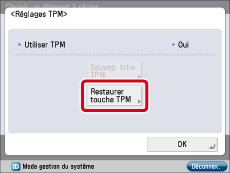 Avant l'activation du réglage TPM, l'administrateur système doit vérifier si les réglages par défaut du code admin. système et du PIN admin. système (réglages de l'administrateur système) sont modifiés. Si les réglages par défaut du code admin. système et du PIN admin. système ne sont pas modifiés, un utilisateur autre que l'administrateur peut effectuer des sauvegardes et la clé de sauvegarde TPM peut être prise. Etant donné que la clé TPM peut être sauvegardée une seule fois, il est impossible de la restaurer.