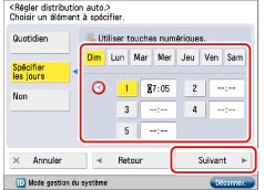 Appuyer sur [Régler distribution auto.] pour <Réglages de transm.> → sélectionner [Quotidien] ou [Spécifier les jours].