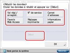 Si l'on ne rétablit pas [Val régl./enregistr.] et [Carnet d'adresses] en même temps, [Régl. envoi URL], sous [Régler boîte Fax/I-Fax], risque d'être effacé.