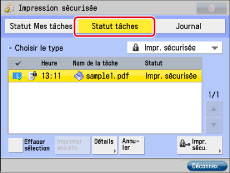 Si la tâche d'impression ne s'affiche pas, appuyer sur [Restreindre tâches d'impression] sous [Réglages de fonction] (Réglages/Enregistrement), puis vérifier le réglage. (Voir "Restriction des tâches d'impression".)