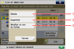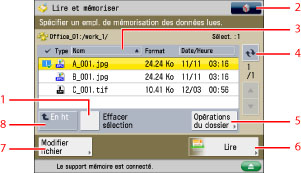 Pour plus d'informations sur l'agencement des dossiers, la modification/suppression des fichiers et l'obtention d'informations détaillées sur les fichiers, voir "Accès aux fichiers enregistrés".