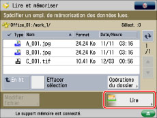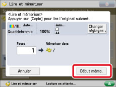 Il est possible de mémoriser jusqu'à 999 pages. Si les originaux lus via le chargeur sont des originaux recto verso, il est possible de mémoriser jusqu'à 1 000 pages. Une fois le nombre maximum d'originaux atteint, un message s'affiche demandant si les autres pages doivent être mémorisées.