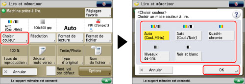 Il est possible de mémoriser un mode couleur souhaité comme réglage par défaut en modifiant les réglages copie par défaut. (Voir "Définition des réglages de lecture et de mémorisation".)
