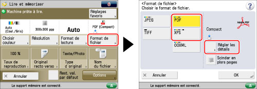 PDF (Compact) ou XPS (Compact) ne peut être utilisé que si les réglages suivants ont été définis :