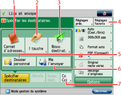 Les destinataires suivants ne peuvent pas être modifiés si un type de destinataire est défini sur "Oui" dans [Limiter nouveau destinataire]. Sélectionner un destinataire mémorisé à l'aide du carnet d'adresses local, du carnet d'adresses distant ou du serveur LDAP sous [Carnet d'adresses], ou en appuyant sur un bouton de composition 1 touche sous [1 touche]. (Voir "Restriction de l'envoi à de nouvelles adresses".)
