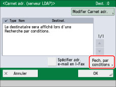 Si [Rech. auto si utilisation serveur LDAP] est réglé sur "Non", l'écran présentant la liste des destinataires reste vide jusqu'à ce qu'une recherche soit effectuée.