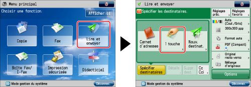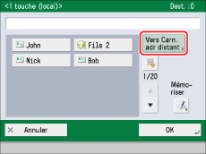 Pour utiliser les boutons de composition 1 touche d'une machine serveur, il est nécessaire de configurer ses réglages. Il convient de régler le carnet d'adresses distant afin qu'il puisse être ouvert en externe sur la machine serveur. Pour plus d'informations, voir les manuels d'utilisation des autres machines de la série imageRUNNER ADVANCE.