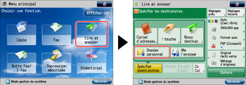 dans le coin supérieur droit de l'écran → [Mém./modifier infos pr chaque utilisateur] → [Dossier personnel]L'administrateur peut restreindre la destination de la transmission de fichiers à chaque dossier personnel de l'utilisateur général. (Voir "Restriction de la destination pour la transmission de fichiers".)
