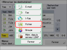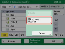 Le premier caractère du nom entré sert au tri de la liste des destinataires lors de l'activation de touches telles que [ABC], [DEF] et [GHI] à l'écran Carnet d'adresses. Un écran permettant d'affiner la recherche dans le carnet d'adresses apparaît lors de l'activation de [Rechercher par nom] à l'écran Carnet d'adresses
