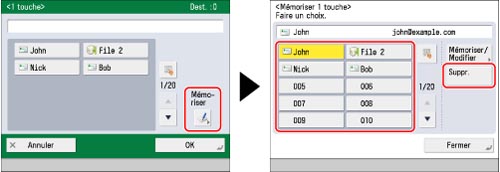 Appuyer sur [Mémoriser] → sélectionner le bouton de composition 1 touche à effacer → appuyer sur [Suppr.].