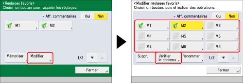 Appuyer sur [Modifier] → sélectionner le bouton sous lequel sont enregistrés les réglages à vérifier → appuyer sur [Vérifier le contenu].