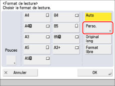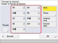 Il est possible de spécifier manuellement un format de lecture lors de la lecture d'originaux ne pouvant pas être détectés à l'aide de [Format auto]. On peut également mémoriser le format spécifié.