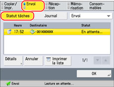 Permet d'afficher les informations détaillées relatives à la tâche sélectionnée. Vérifier les informations détaillées → appuyer sur [OK] pour revenir à l'écran Envoi.