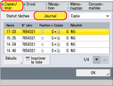 Affiche des informations détaillées sur la tâche sélectionnée. Vérifier les informations détaillées → appuyer sur [OK] pour revenir à l'écran Copier/Imprimer.