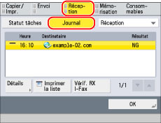 Affiche des informations détaillées relatives à la tâche sélectionnée. Vérifier les informations détaillées → appuyer sur [OK] pour revenir à l'écran Réception.