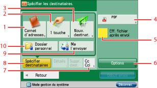 Appuyer sur [Vers Carnet adr dist.] pour indiquer les destinataires mémorisés sous les boutons de composition 1 touche d'une machine serveur en accédant depuis une machine cliente sur le réseau. Pour plus d'informations, voir "Spécification d'un destinataire à l'aide des boutons de composition 1 touche d'une machine serveur".