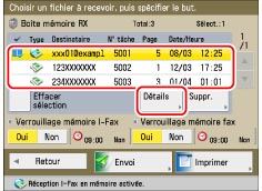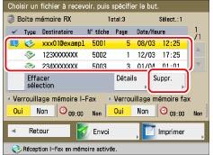 Vérification des informations détaillées/suppression d'un fichier stocké dans la Boîte mémoire RX