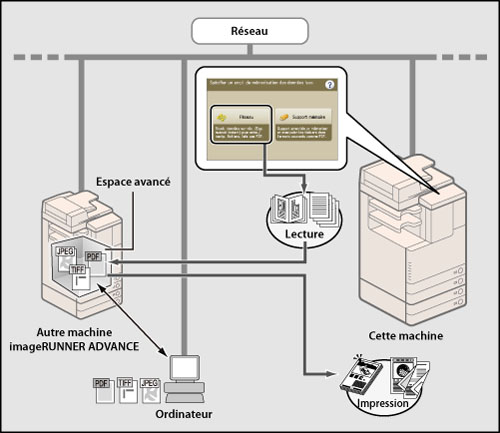 La sélection de l'espace avancé d'une autre machine de la série imageRUNNER ADVANCE depuis [Réseau] permet de lire un document et de le mémoriser dans l'espace avancé d'une autre machine de la série imageRUNNER ADVANCE. Il est également possible d'utiliser cette machine pour imprimer des fichiers mémorisés dans une autre machine de la série imageRUNNER présente sur le réseau.