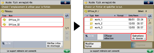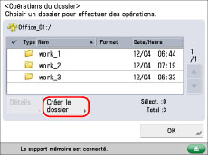 Sélectionner l'espace mémoire souhaité → sélectionner le niveau de dossier souhaité → appuyer sur [Opérations du dossier].