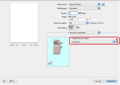 Si l'on utilise Mac OS X 10.5 ou ultérieur, cliquer sur le bouton [] situé en regard de [Imprimante] pour afficher tous les réglages dans la boîte de dialogue [Imprimer].