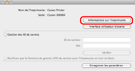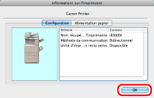 Si le nom du pilote d'imprimante indiqué en haut de la boîte de dialogue [Informations de l'imprimante] et celui présenté comme [Nom récupéré de l'imprimante] ne correspondent pas, il se peut que les fonctions de l'imprimante ne donnent pas les résultats attendus. Si les noms sont différents, supprimer l'imprimante qui a été ajoutée dans [Préférences Système], puis ajouter de nouveau cette imprimante. Pour plus d'informations, voir le Printer Driver Installation Guide (voir " Installation").
