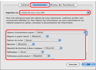 Cliquer sur [Gestionnaire] → vérifier que l'imprimante utilisée est bien sélectionnée dans [Imprimer via] → définir les options installées sur l'imprimante.