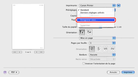 Pour modifier un préréglage, le sélectionner dans la boîte de dialogue [Imprimer] → spécifier les paramètres du pilote d'imprimante → sélectionner [Enregistrer] dans [Préréglages].