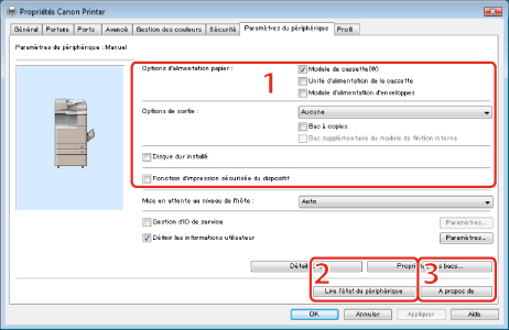 Il est possible de configurer les options d'imprimante (notamment les options d'alimentation papier, les options de sortie papier, etc.) installées sur la machine.