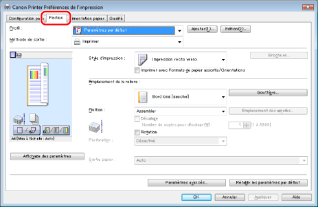 Il est impossible de définir les options de [Finition] dans l'onglet [Finition] lors de la réalisation d'une impression au format brochure.