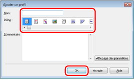S'il n'est pas possible de choisir un profil, accéder à la boîte de dialogue des propriétés de l'imprimante à partir du [Panneau de configuration], cliquer sur l'onglet [Profil], puis vérifier si les options [Autoriser la sélection de profils] et [Autoriser la modification des paramètres] sont sélectionnées. Pour plus d'informations sur l'accès à la boîte de dialogue des propriétés de l'imprimante, voir "Définition des options de l'imprimante".