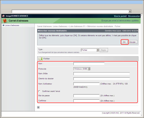 Spécifier les réglages souhaités dans l'écran [Mémoriser nouveau destinataire : Fichier] → cliquer sur [OK].