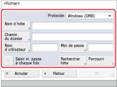 Saisir le nom de l'ordinateur trouvé à l'étape 1 dans "Création d'un dossier partagé (Windows)", ou à l'étape 2 dans "Création d'un dossier partagé (Mac)". Il est également possible d'appuyer sur [Rechercher hôte] pour rechercher l'ordinateur cible.