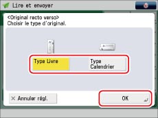 Sélectionner [Original recto verso] → indiquer le type d'original recto verso → appuyer sur [OK].