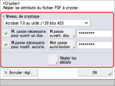 Les fichiers PDF peuvent être cryptés par mot de passe. Seuls les utilisateurs saisissant le mot de passe correct peuvent ouvrir, imprimer ou modifier le PDF. Pour utiliser cette fonction, le Kit de fonctions avancées est requis.