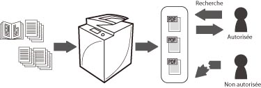 En mode PDF avec prise en charge des recherches, il est possible de convertir des documents papier en fichiers PDF qui permettent de rechercher du texte. Par exemple, on peut économiser de l'espace en numérisant des documents papier comme des curriculum vitae. Le cryptage des fichiers PDF permet d'en interdire l'ouverture et la recherche d'informations aux utilisateurs non autorisés. Grâce à la définition d'un mot de passe lors de l'envoi de documents lus, la fuite d'informations peut être évitée au cas où les documents seraient transmis au mauvais destinataire.